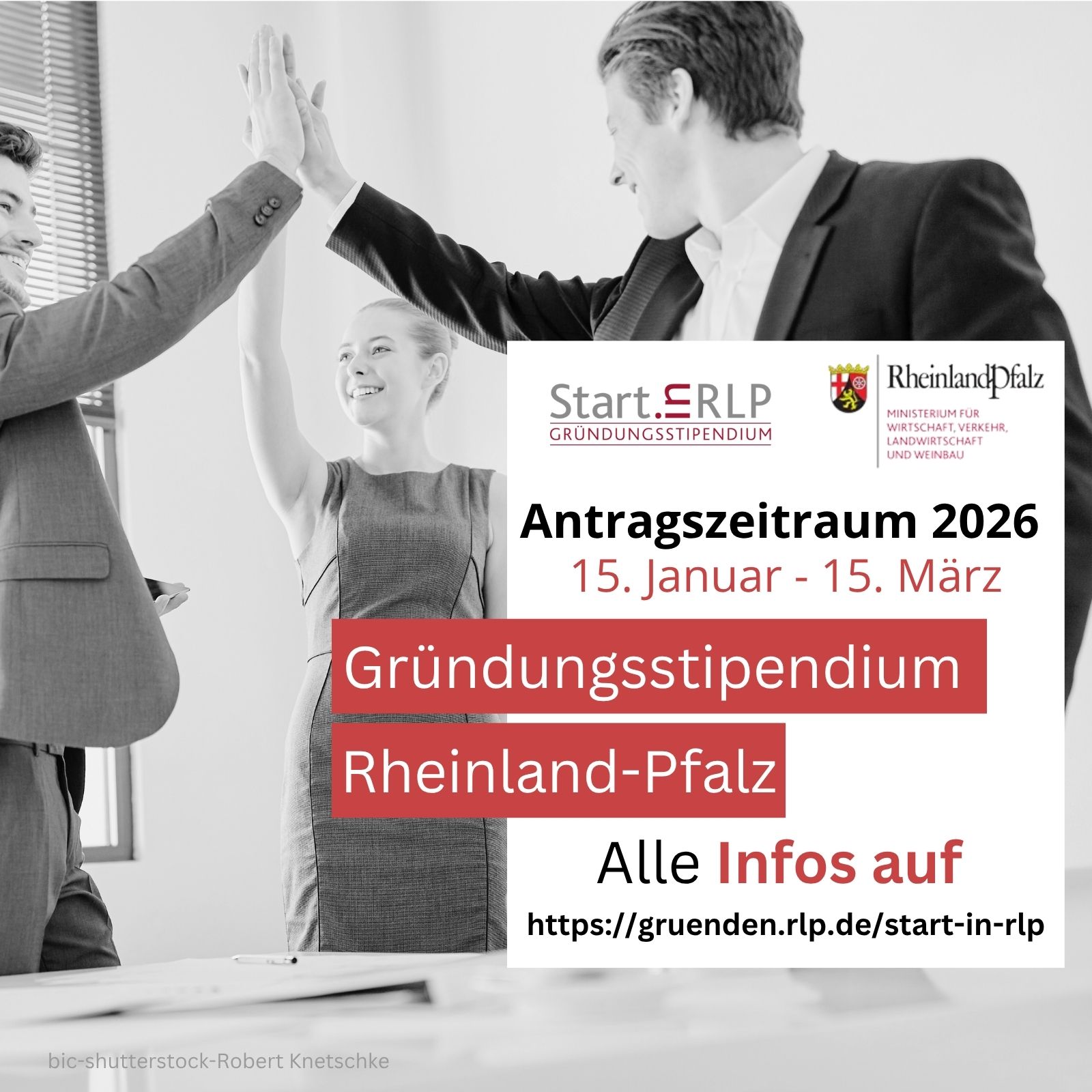 Am 1. Oktober 2023 hat das Business + Innovation Center Kaiserslautern als Koordinationsstelle für das Ministerium für Wirtschaft, Verkehr, Landwirtschaft und Weinbau die Betreuung des Gründungsstipendiums Rheinland-Pfalz übernommen. Auch im Jahr 2026 werden wieder Stipendien vergeben, die Antragsfrist beginnt am 15. Januar 2026 und endet am 15. März 2026. Alle News dazu gibt es auch auf der Webseite des Programms. Die Koordinationsstelle steht Stipendiat*innen, Interessierten und Netzwerkpartner*innen bei Fragen unter folgender E-Mail-Adresse zur Verfügung: hello@startinrlp.de.